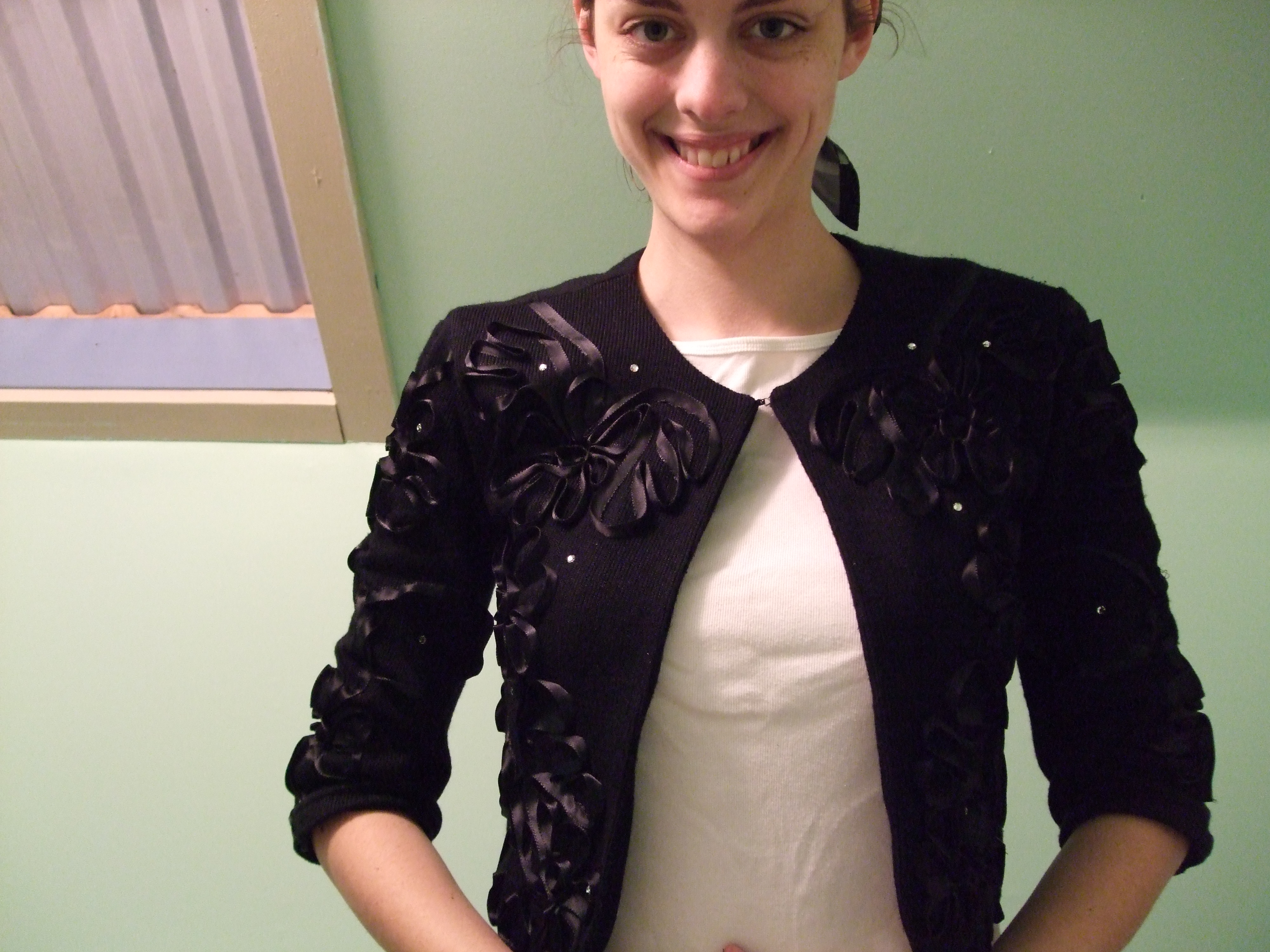 I was the first one to open a Christmas present this morning. My family watched with baited breath as I unwrapped it, and pulled a black sweater out of the box. It was covered with rhinestones and ribbon detailing and had obviously come from a thrift store.