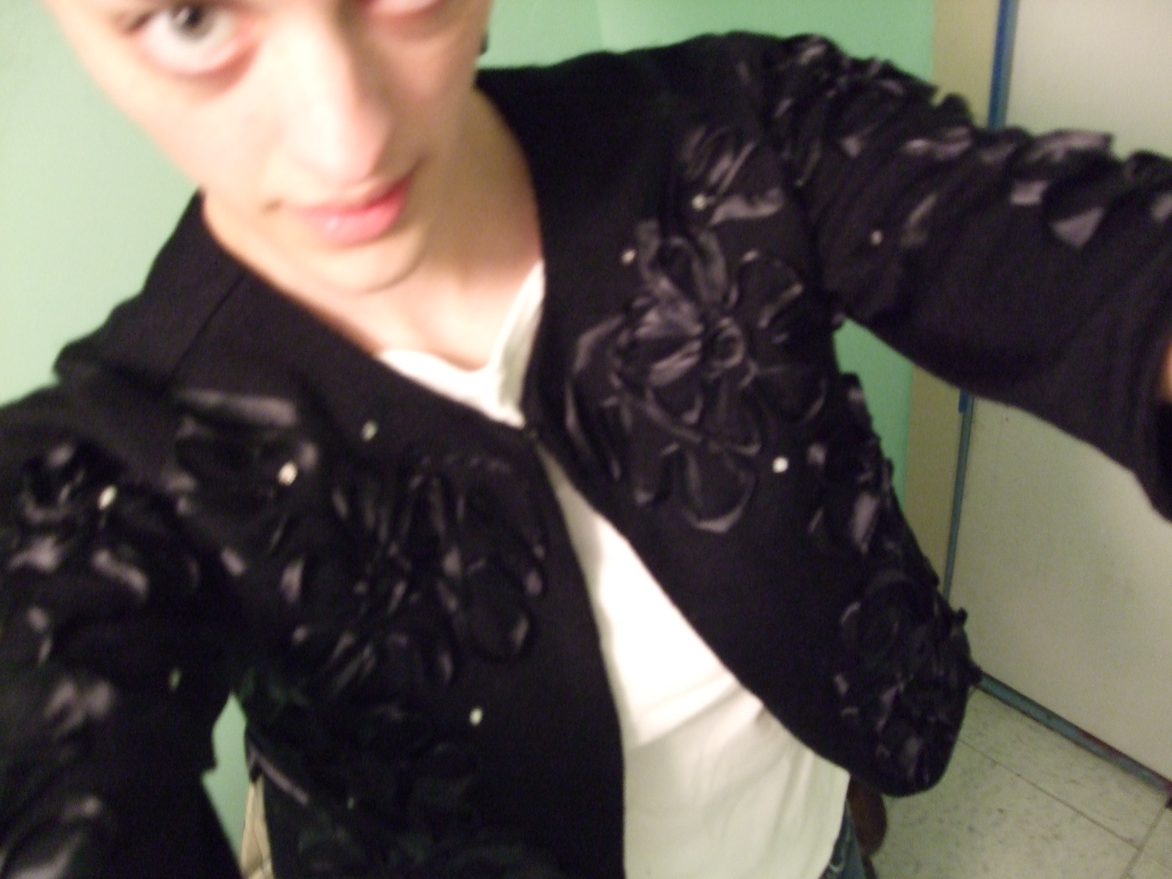 There. That is how the sweater looked on me only it was fancy and covered with ribbons and rhinestones.