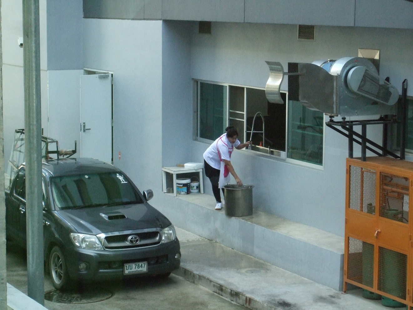 This lady twisted the faucet around so she could wash her giant pot outside the window.