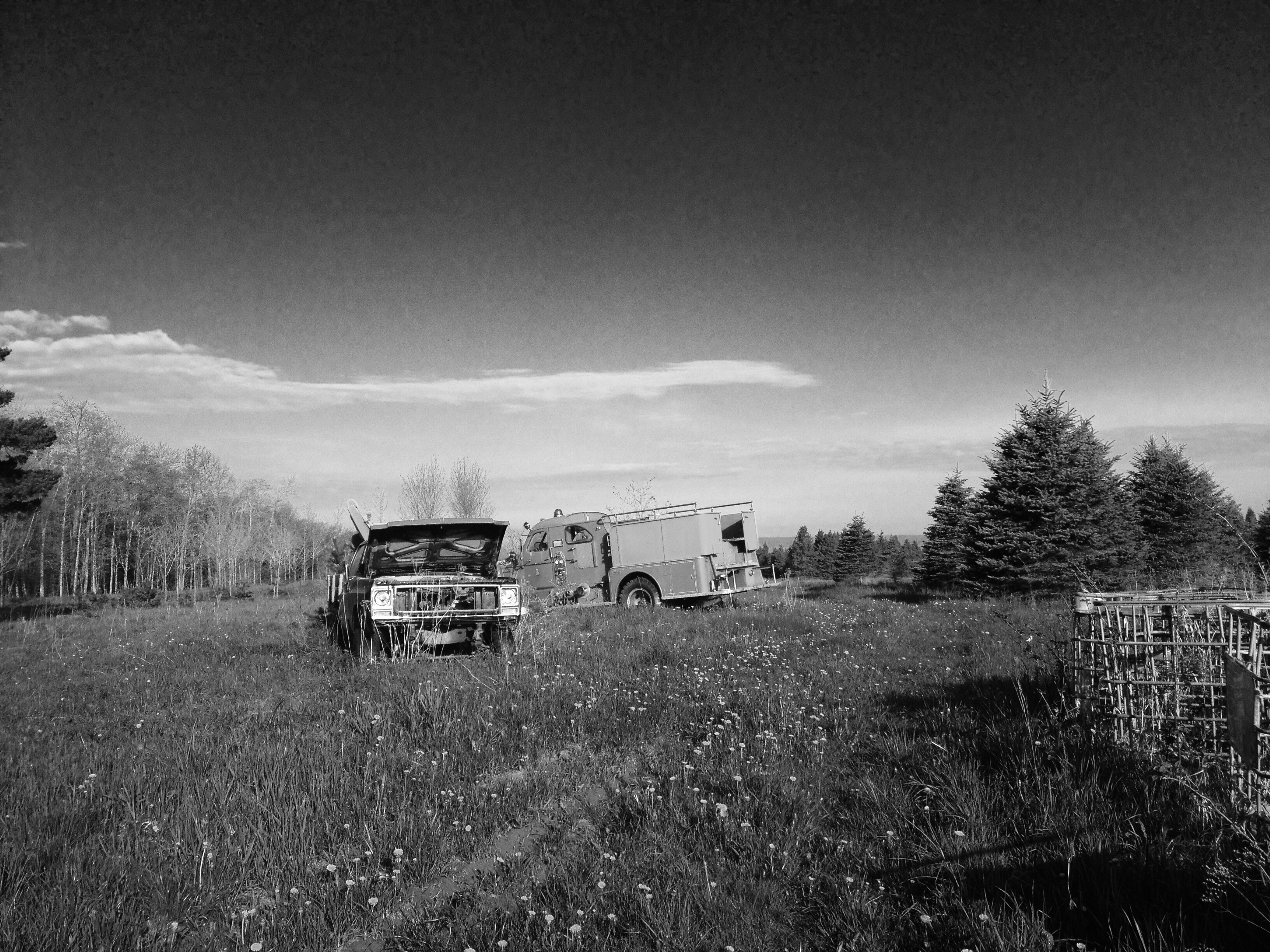 I drank tea and then wandered over the property, with its meadows, its Christmas trees that never sold, and it’s broken-down machinery. I took a picture and then tried to upload it for this blog post. It was too big. I couldn’t figure out how to re-size it, so I made it black and white and then it uploaded. Colored pictures will have to wait until I have a better internet connection, I guess.