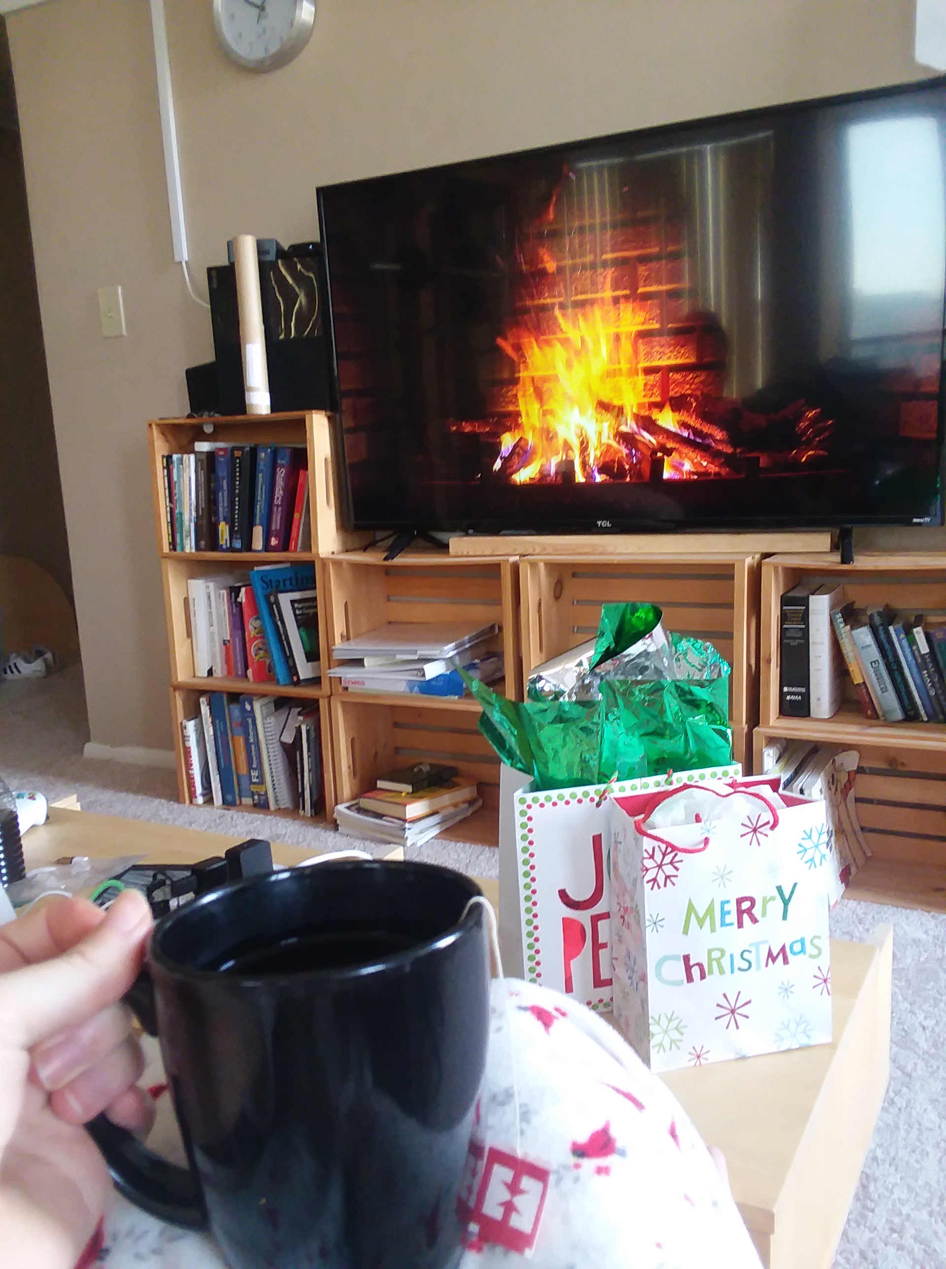 The next morning we put a youtube video of a fire on the TV, played Christmas carols, and opened the gifts we’d purchased for each other.