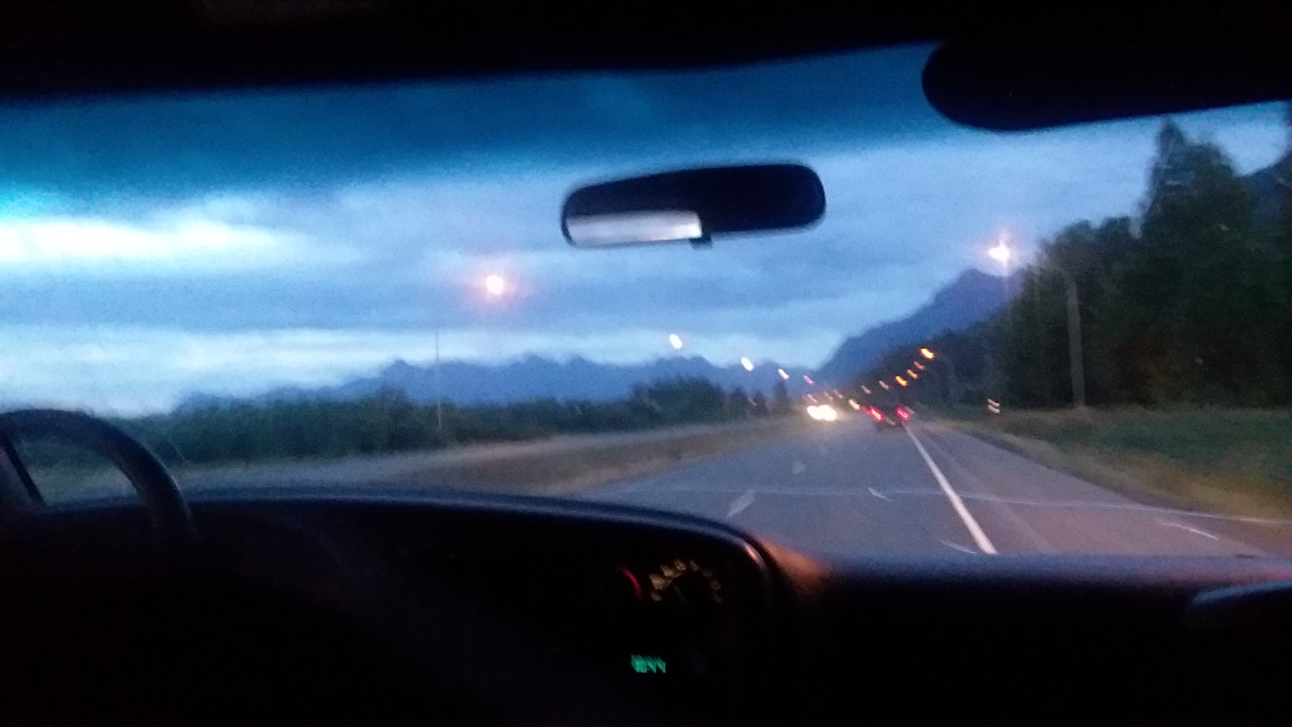 I snapped this blurry photo out the car window, trying to capture the looming mountains as well as the endless twilight. It was too far south, and too late in the year, to see the midnight sun. But the golden hour stretched on and on, and when the sun finally set at 10 pm, the twilight seemed never-ending.