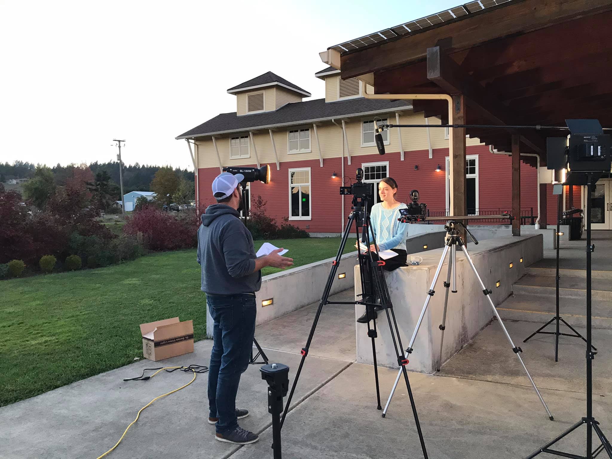 It would have given a similar vibe, I think. After all, I did just as much writing in libraries on this trip as I did in coffee shops. Maybe more. But as Chris set up his multiple cameras, fancy lights, and three types of microphones, the sun slowly slid behind the Coast Range. I shivered in the cold October twilight.