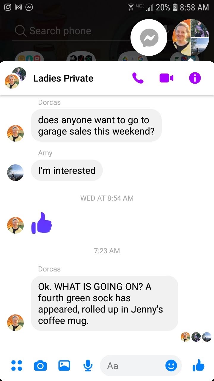 Jenny’s immediate assumption was that Mom had taken one of the green socks from the enamel bowl and stuck it in her mug as a prank. But when Mom came along and Jenny showed her the sock, Mom was completely baffled. She whipped out her phone and sent a message to the group chat.
