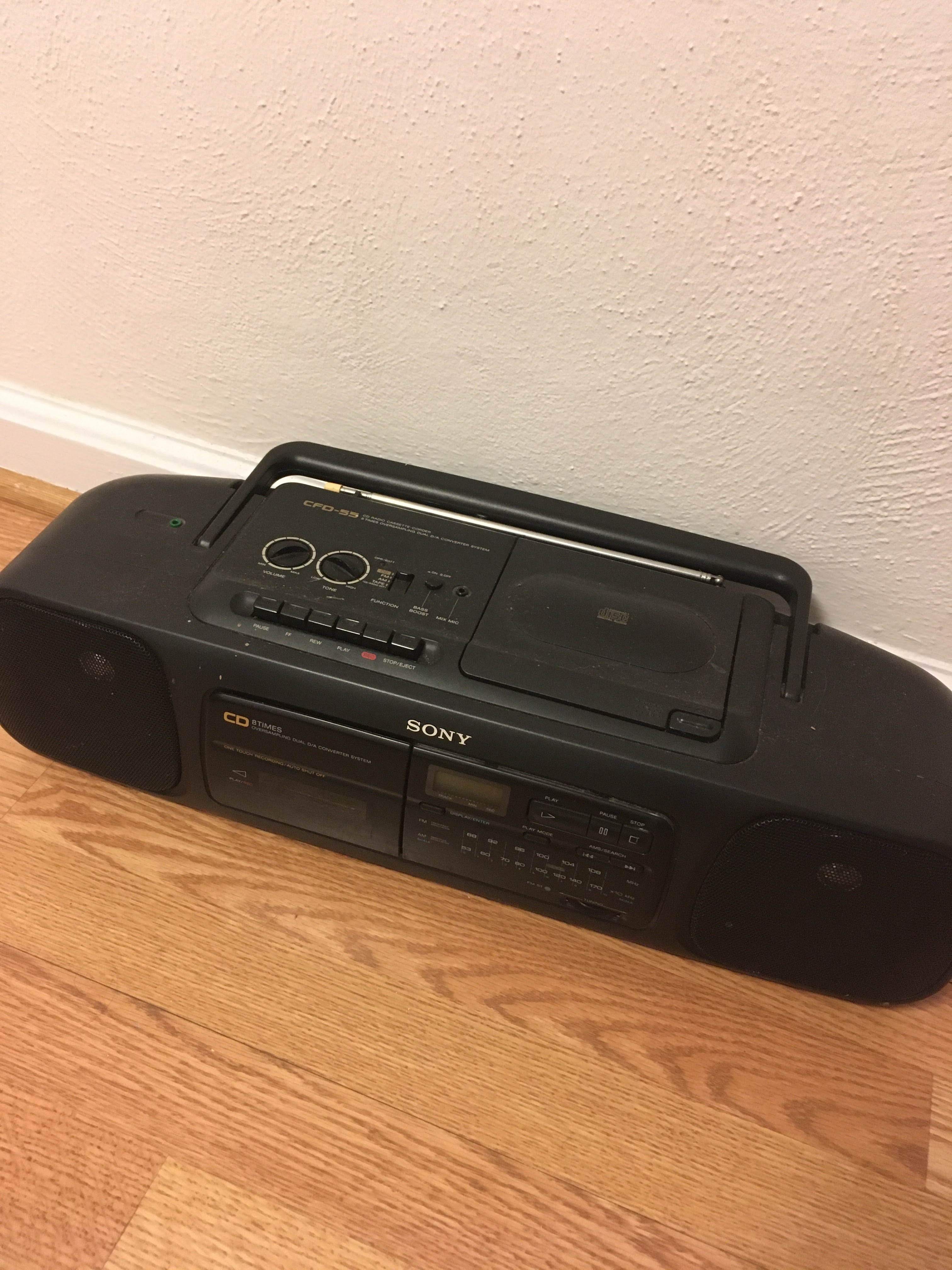 Then in the Buy Nothing group one day I saw a cassette player with a headphone jack. It was bigger than I imagined, and when I finally picked it up it was…well, a rather large boom box. But! It also has a CD player and a radio, so lots of musical options. Also, ever since the CD player in my car randomly quit I’ve had no way to play my CDs. So win win, except I had to buy a large quantity of enormous batteries for it.