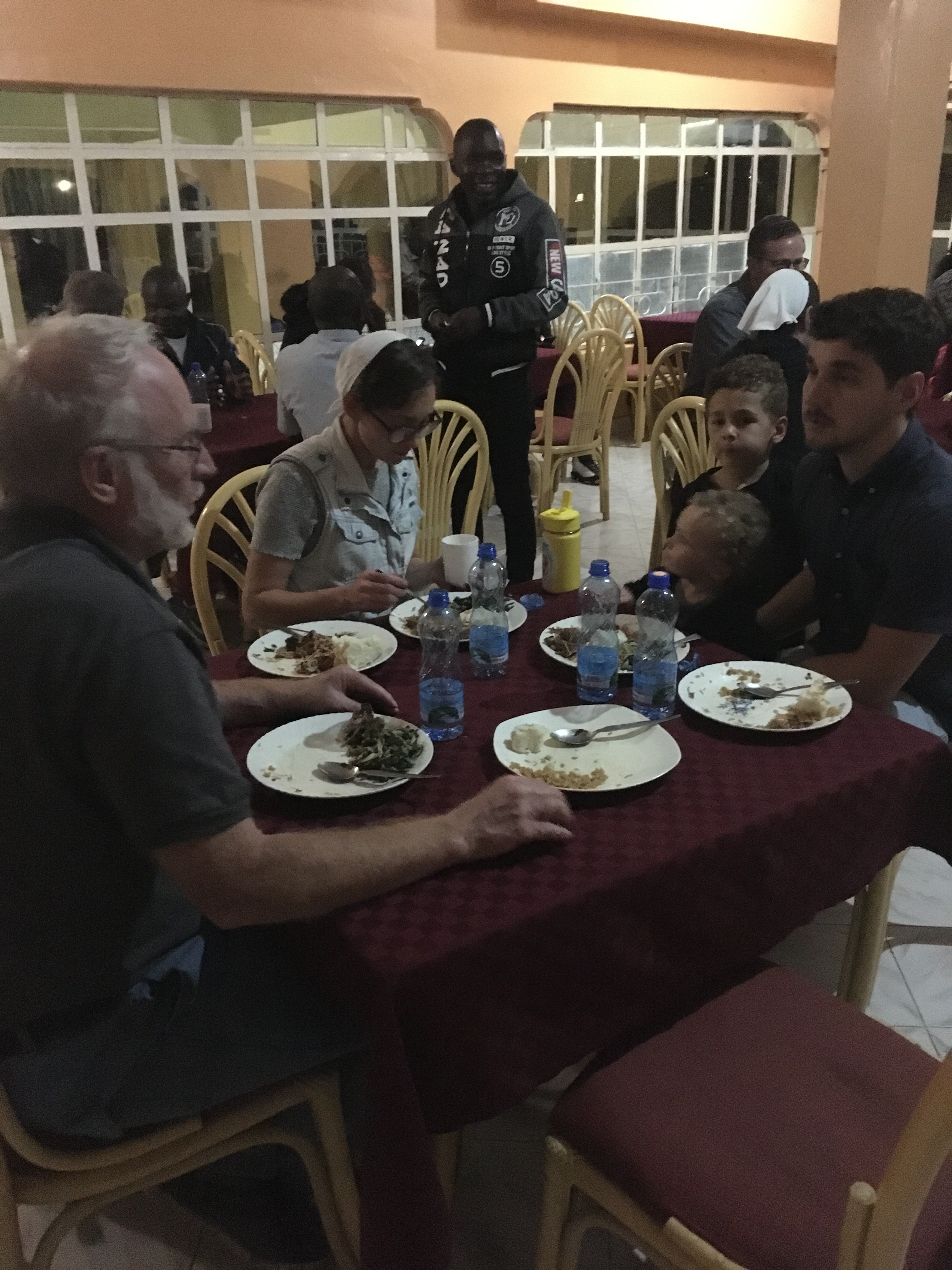 After this opening session, we all went downstairs to the restaurant for supper. Amazing food as usual, but I can’t remember specifically what we ate. I did snap one blurry pic on my phone I guess…looks like rice, ugali, some greens, and some meat?