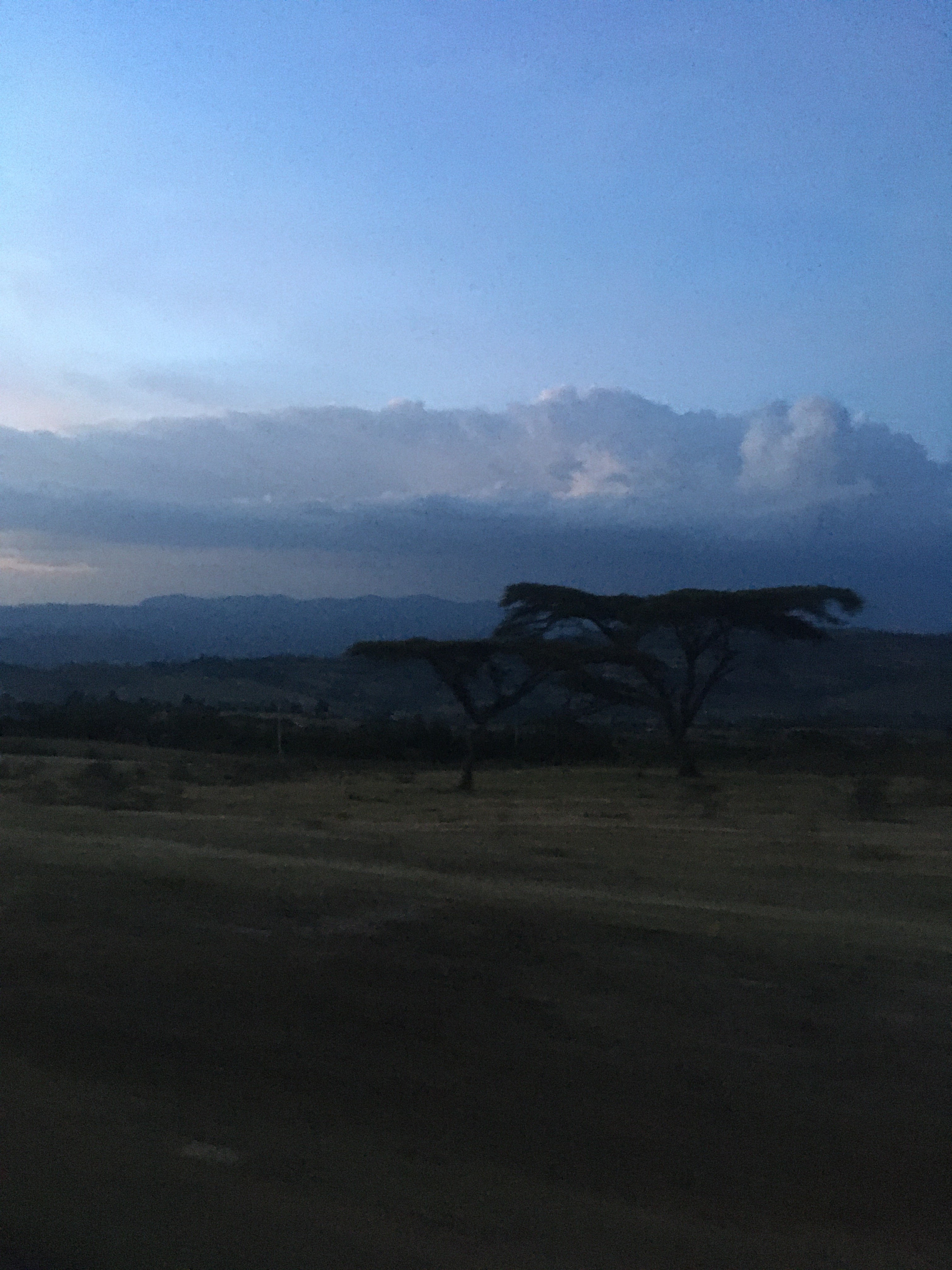 The most beautiful part of the drive was when twilight struck just as we reached a hilly wilderness full of African umbrella trees, silhouetted against the purple-blue sky. I tried to get a picture on my phone but it was mostly blur.