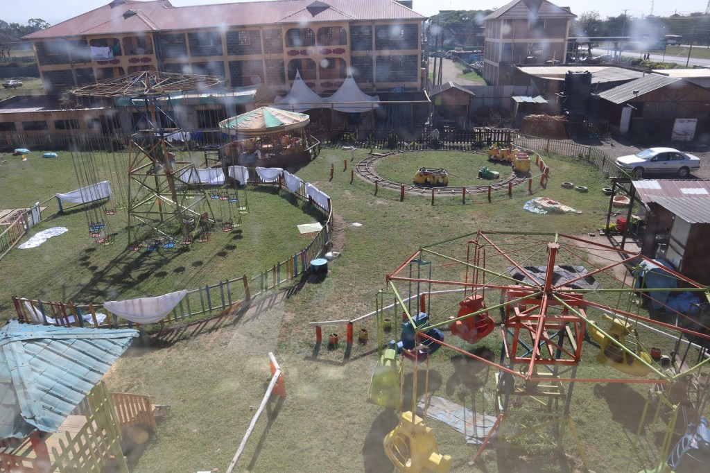 We couldn’t just set a camera up in the office, because it was full of people and meetings. So we wandered around the complex for a while trying to find a suitable place. I never did quite understand the Cool Rivers hotel. In the Kenyan way, all the hallways were half outdoors, and it seemed to ramble on and be full of strange random rooms. (Once, on my way to the bathroom, I looked out the window and saw something like an abandoned amusement park or fairgrounds.)
