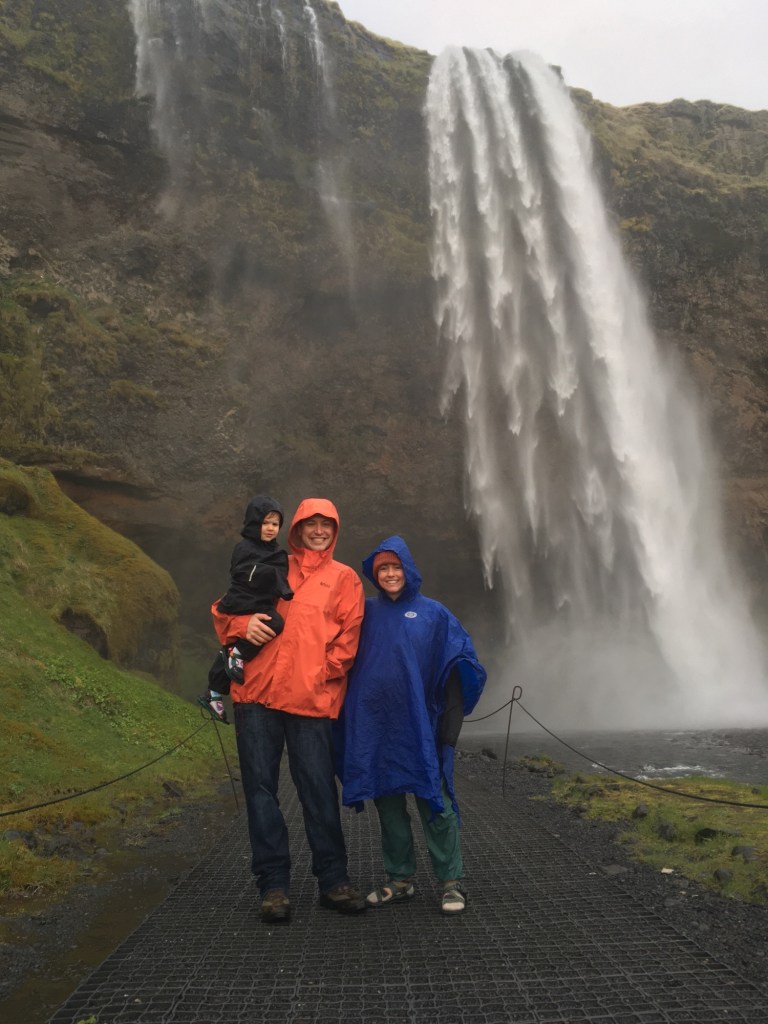 I pulled on the black free poncho, and Annie pulled the blue one over herself and Hannah. We walked out to the thundering falls. This is it! We are really, truly in Iceland.