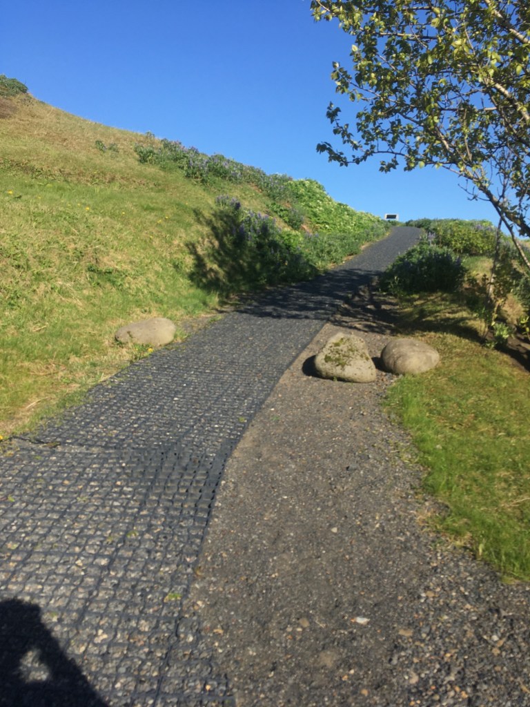 It was time for a Charger Quest. In order to get work done I needed power, and they use a different sort of plug in Iceland. I had a vague idea that there might be a shop just south of the campground that would sell such a thing, and sure enough, when I looked across the field I could see the logo of the discount grocery store.