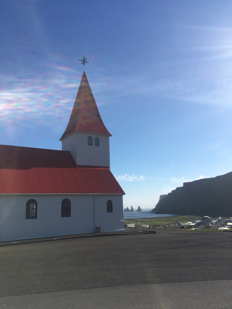 As we approached Vik, we saw a red-roofed church on a hill, bright and white in the deepening twilight. It was nearing midnight, and when we pulled up to the campground, we realized reception had closed at 11 pm. Oh well. We’d just pay in the morning. We found an empty spot, plugged in, set up the beds, and fell asleep.